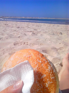Bolas de Berlim são a melhor coisa do mundo principalmente sem creme e acuradas, mas na praia parece que tudo tem outro sabor, também gosto de levar fruta como meloa, melancia, uvas. Já cortada ao pedaços super fácil de comer e sabe muito bem na praia.